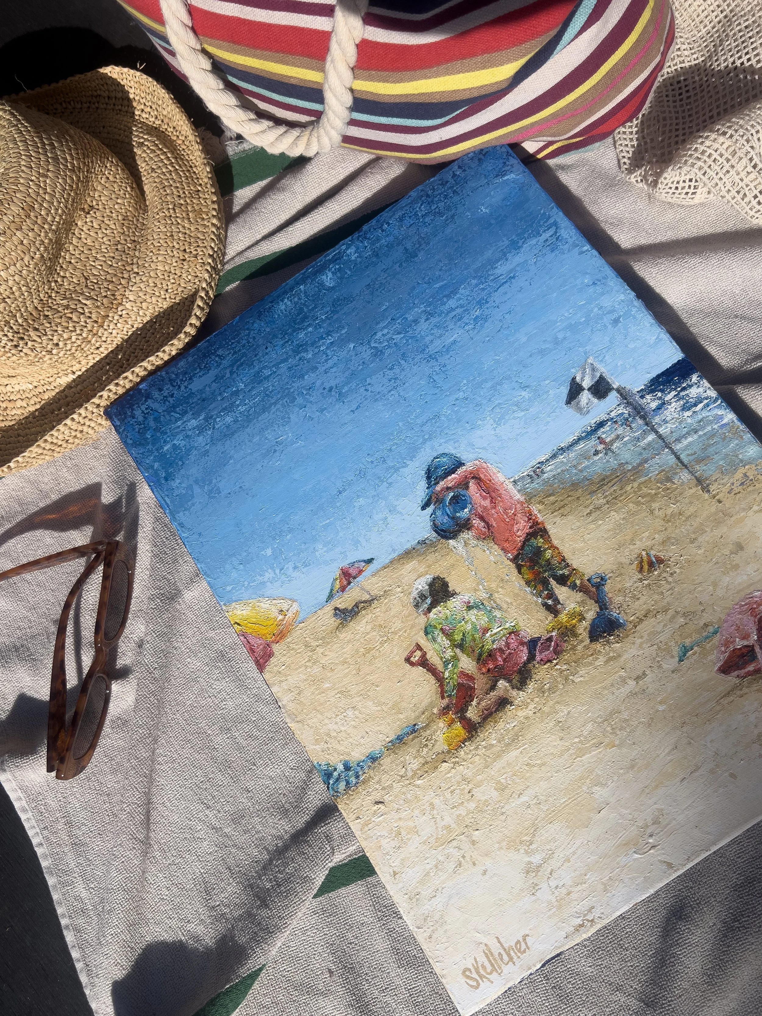 These ordinary yet iconic moments are the heartbeat of my figurative beachscape paintings. I’m not just painting the beach—I’m painting how we fit into it. There’s something nostalgic about it. The way we lie back on our beach towels, huddle in the shade of bright umbrellas, the way kids dig with plastic spades, how the shadows stretch on the sand and the sun reflects off the water—it all feels timeless.